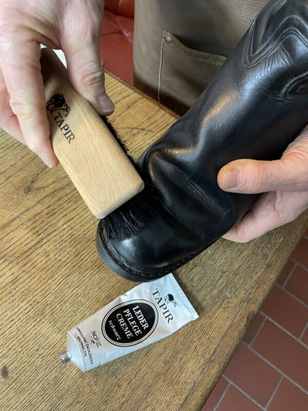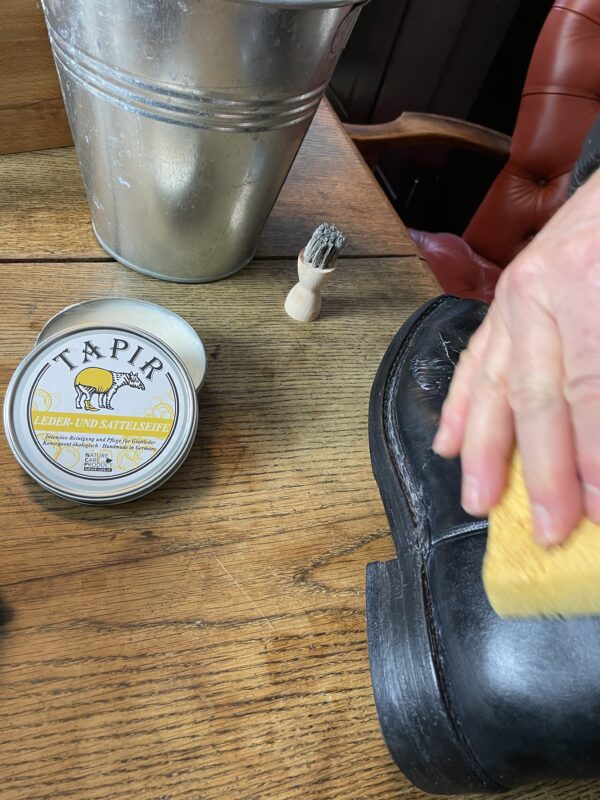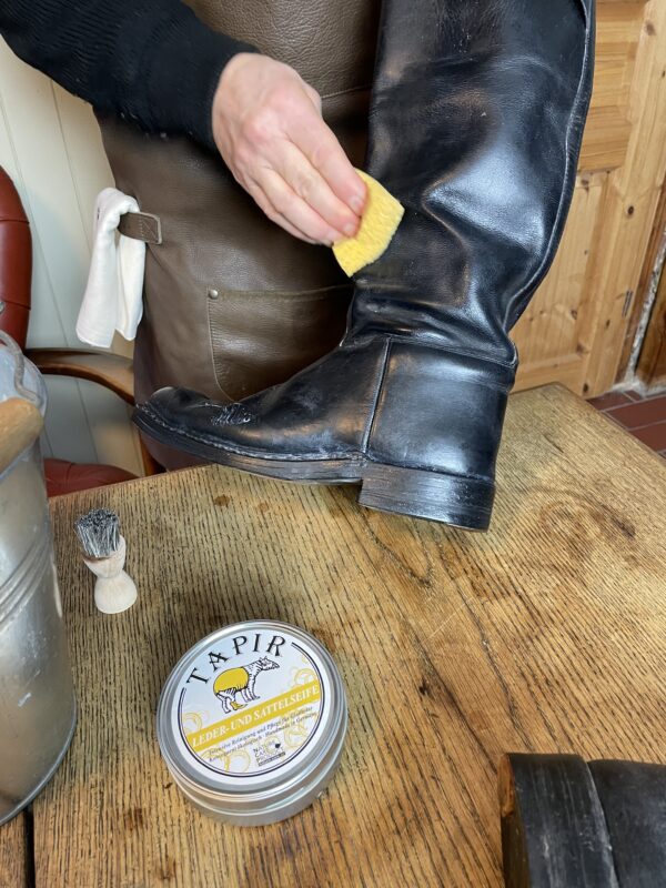 Bevor wir mit der Lederpflege starten, muss der Stiefel zunächst einmal vom Stallstaub, Schmutz und Pferdehaaren befreit werden. Hierfür eignet sich für Glattleder am besten Tapirs Ledeseife!