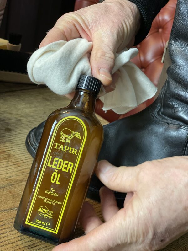 Das Leder benötigt nun eine gute und natürliche Lederpflege. Das Leder ist nicht zu trocken, so dass das Lederfett nicht unbedingt sein muss, sondern in diesem Fall haben wir uns als Erhaltungspflege für unser Lederöl entschieden. Hierfür einfach etwas auf ein sauberes Baumwolltuch geben und den gesamten Stiefel damit einmassieren.