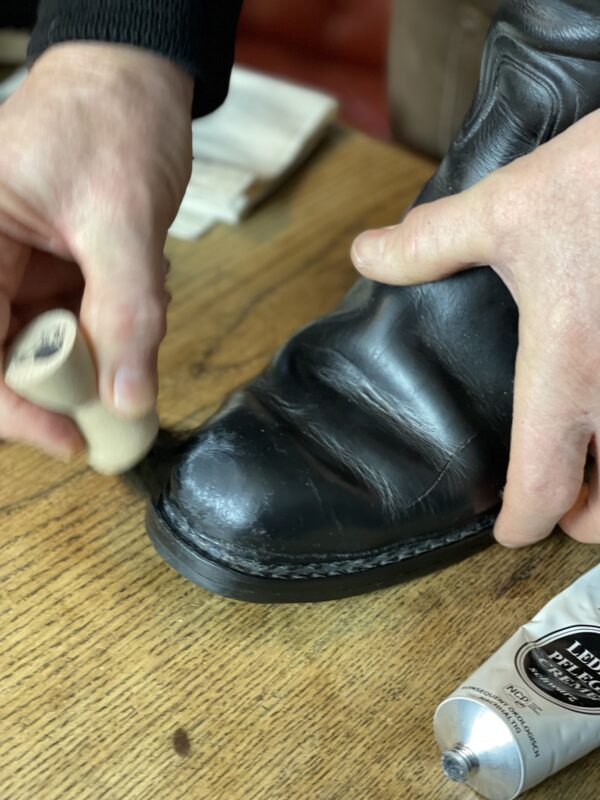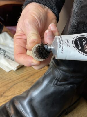 Für die Schuhkappen gibt es eine extra Portion Schuhpflege. Damit diese zu richtig viel Glanz kommen und das natürliche Schwarz des Leders wieder aufgefrischt wird, haben wir uns hier für die Schuhcreme in schwarz entschieden. Einfach ein bisschen Schuhcreme auf die Auftragsbürste geben und damit die Kappe einmassieren. Dabei auch nicht die Nähte vergessen!