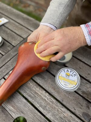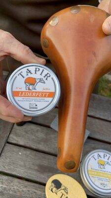 TAPIR-TIPP: Fetten Sie den Sattel vor dem ersten Fahren ordentlich mit dem Lederfett ein, einziehen lassen, Überschuss abnehmen und nachpolieren nicht vergessen. Fahren Sie mit dem frischen Sattel. Da das Fett das Leder etwas weicher macht, führt das anschließende Fahren dazu, dass sich der Fahrradsattel optimal an Ihren persönlichen Sitz anpasst! Das Fahren wird dann um einiges angenehmer.