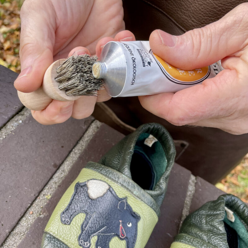 Tragen Sie zunächst etwas von der natürlichen Schuhcreme entweder mithilfe des Baumwolltuchs oder der Auftragsbürste (je nach Vorliebe bzw. schwer erreichbarer Stellen am Schuh) gleichmäßig auf. Verteilt wird dann am ganzen Schuh, erst die Nähte und der Schaft und dann das ganze Leder, Schuhcreme immer wieder nachnehmen aber gut dosieren.
