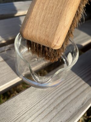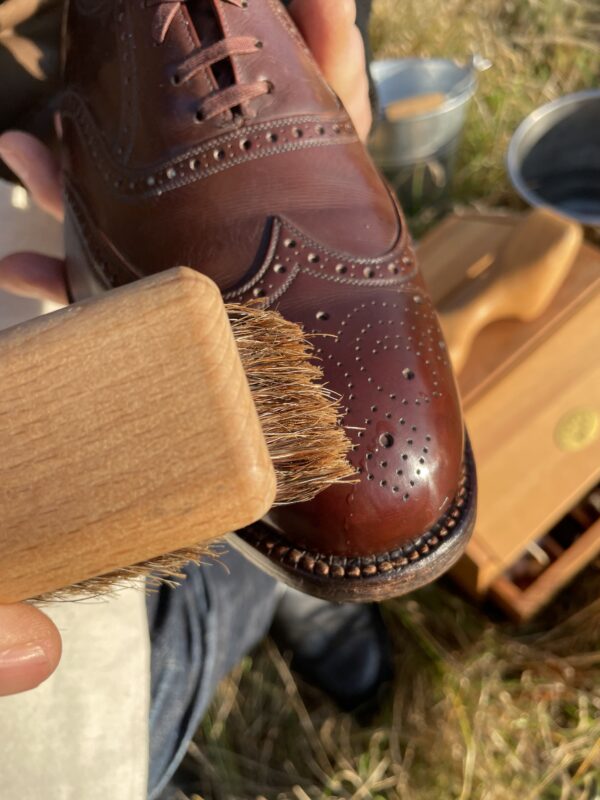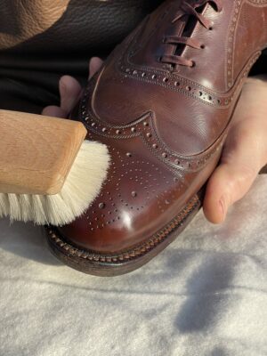 Anschließend nutzt man die Glanzbürste und ganz wenig Wasser, in das vorher ein Schuss Haushaltsessig gegeben wurde, um die Schuhkappe auf Spiegelglanz zu polieren. Man sieht direkt beim Bürsten, wie das Leder wunderbaren Glanz enthält!