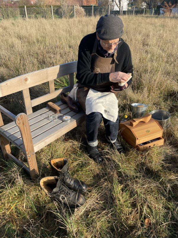 Zuallererst muss der Schuh natürlich gut gereinigt werden, damit man keine Schmutzpartikel tiefer ins Leder einmassiert. Dies gelingt am besten mit Tapirs Lederseife und einer Schmutzbürste. Eine genaue Anleitung zum Umgang mit unserer Seife und Schmutzbürste finden Sie beispielsweise hier.