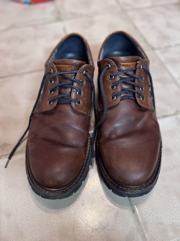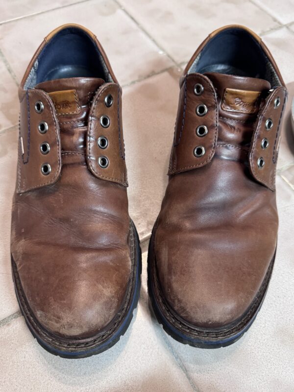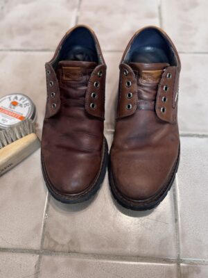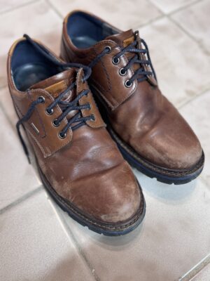Heute habe ich mich braunen Herrenschuhen aus Glattleder gewidmet. Die letzte Schuhpflege ist schon einige Zeit her, sie haben unten am Sohlenrand etwas losen sichtbaren Dreck und außerdem fehlt es dem Leder an reichhaltiger Pflege und es ist bereits leicht trocken.