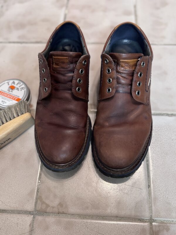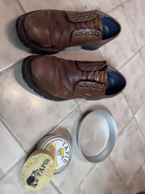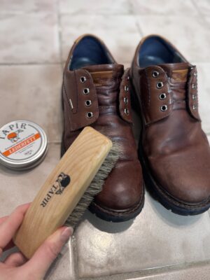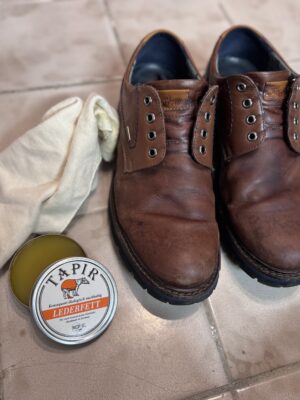 Für die Lederpflege und Auffrischung brauner Herrenschuhe aus Glattleder empfiehlt Tapir: