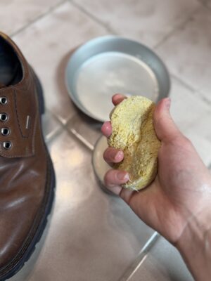 Dann geht es auch schon ans Putzen! Nehmen Sie mit dem angefeuchteten Schwamm etwas von der Lederseife auf und knautschen ihn solange, bis ein schöner Schaum entsteht. Mit diesem wird der Schuh jetzt gereinigt. Massieren Sie den Schaum so lange ins Leder ein, lassen ihm eine kurze Einwirkzeit und spülen ihn mit Wasser wieder aus.