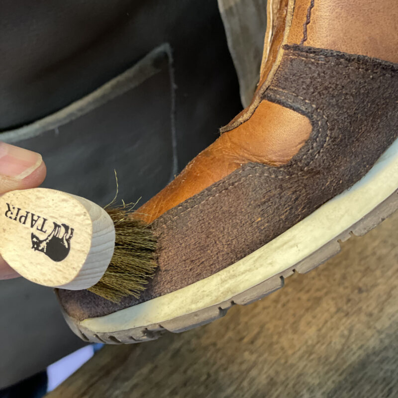 Für ein präzises Auftragen von flüssigen Produkten, wie beispielsweise dem „Draußen unterwegs! Nässeschutz“ oder der Ledersohlenpflege eignet sich besonders gut Tapirs Auftragspinsel. Auch der Pinsel besitzt Borsten aus feinstem Rosshaar, welche ideal für die Aufnahme und ein gleichmäßiges Verteilen von Tapirs flüssigen Pflegeprodukten sind. Das Rosshaar ist weich und flexibel, wodurch die Produkte schonend aufgetragen werden können, ohne die Sohle oder das Material zu reizen und beschädigen.