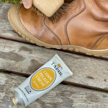 Suchen Sie eine Schuhcreme für Ihre Glattleder Schuhe, die man einfach und regelmässig verwenden kann? Die Lederpflegecreme von Tapir ist die richtige Schuhcreme für die regelmäßige und vor allem einfache Anwendung. Die Schuhcreme lässt sich mit einer Auftragsbürste oder einem Baumwolltuch wunderbar auf dem Leder auftragen. Wir empfehlen, die Lederpflegecreme zunächst auf den Nähten, rund um den Rand und an der Kappe zu verteilen, dann den Rest sorgfältig ins Leder einmassieren. Eine kurze Trocknungszeit und dann mit einer Glanzbürste durch Reibung den Schuh auf Glanz bringen. Gut geschützt durch den Alltag!