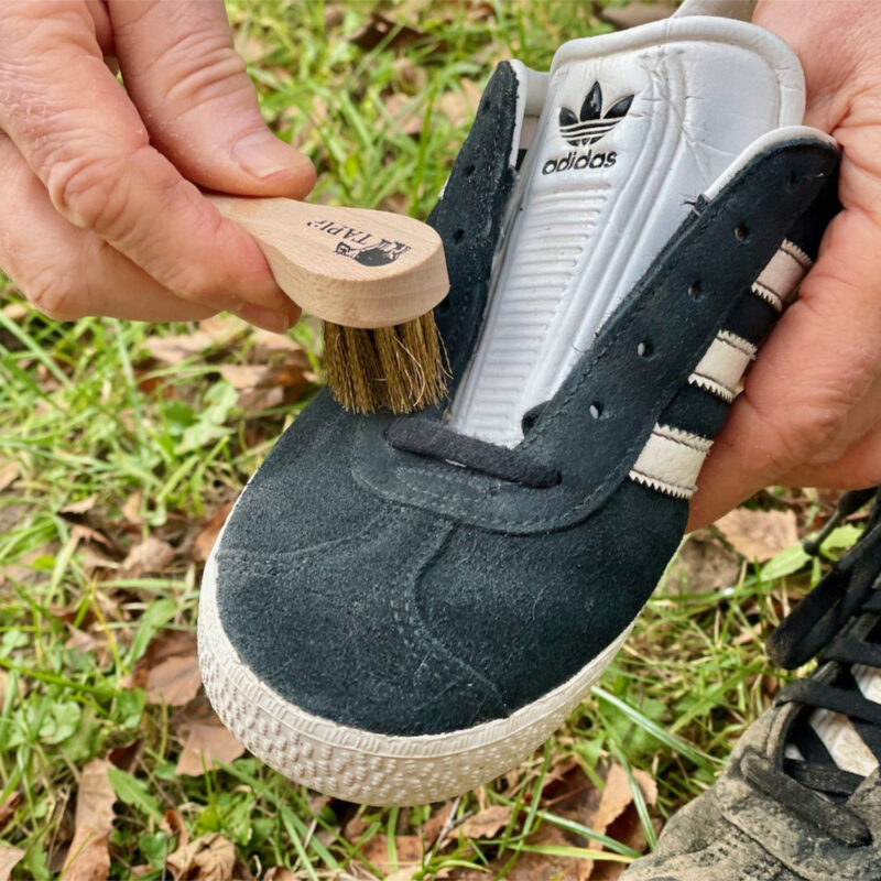 Bei Verschmutzung empfiehlt sich immer zuerst eine Trockenreinigung mit Tapirs praktischer Wildlederbürste mit Messingborsten. Diese löst hartnäckigen Schmutz, feinen Staub und andere Ablagerungen effektiv, aber sanft und schonend, ohne das Material zu beschädigen. Gleichzeitig sorgt man mit der Wildlederbürste dafür, dem Leder wieder sein charakteristisches Aussehen wiederzuerlangen, indem die Fasern wieder aufgestellt werden.